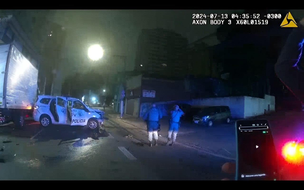 A câmera corporal de um agente da Polícia Militar de São Paulo capturou o momento em que ele sugere a um colega, em outra viatura, uma aposta de corrida. O caso aconteceu em 13 de julho de 2024, quando o policial, após a proposta, acelerou o carro oficial da corporação até colidir com dois veículos estacionados e, em seguida, com o poste de um semáforo. Embora o acidente tenha ocorrido em julho, as imagens vieram a público apenas nesta semana, gerando repercussão e críticas.